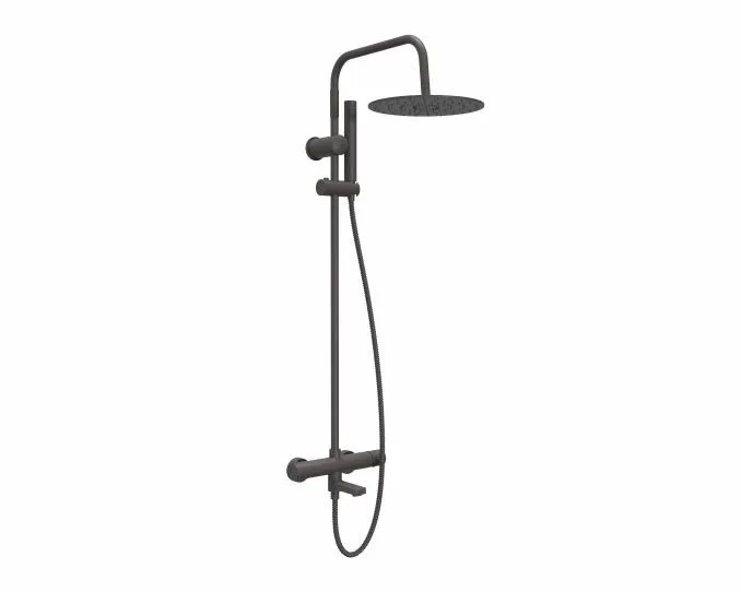 Copen Nook set uključuje bateriju sa donjim prebacivačem, usponski tuš, ružu Ø250mm, tuš ručicu i tuš crevo od 1,5m, sve u gan metal boji.