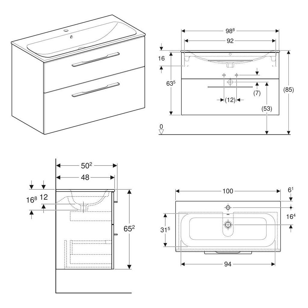 Geberit Selnova Square set ugradni umivaonik, tanak rub, sa ormarićem, dve fioke 100×65,2×50,2 cm, Orah