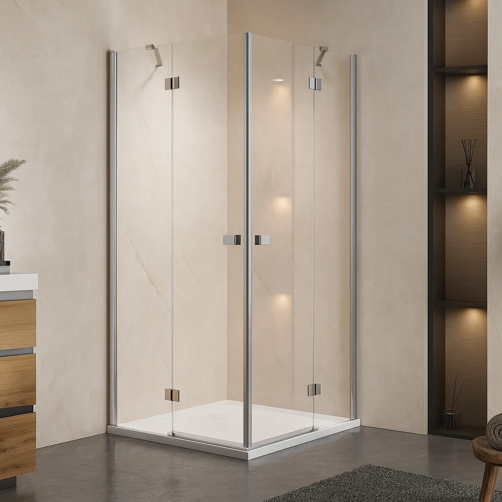Model Q90 ima dvoja vrata na šarke koja se otvaraju prema spolja, sa bočnim fiksnim panelima levo i desno. Kombinacija prozirnog kaljenog stakla debljine 6 mm, stabilne konstrukcije i magnetnog zatvaranja čini ovu kabinu pouzdanim i estetski dopadljivim rešenjem za moderno kupatilo.