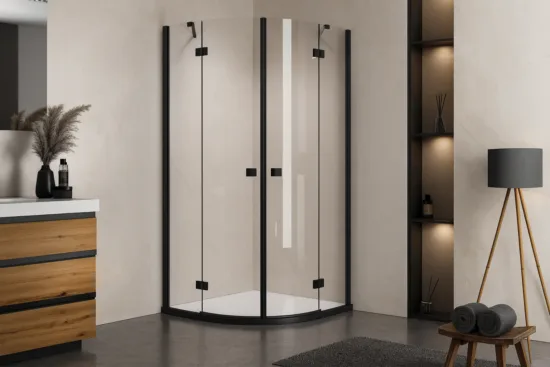 Kabina ima dva fiksna zakrivljena panela i dvoja vrata na šarke koja se otvaraju prema spolja. Kaljeno prozirno staklo i elegantna crna završna obrada čine ovaj model idealnim za moderno uređena kupatila.