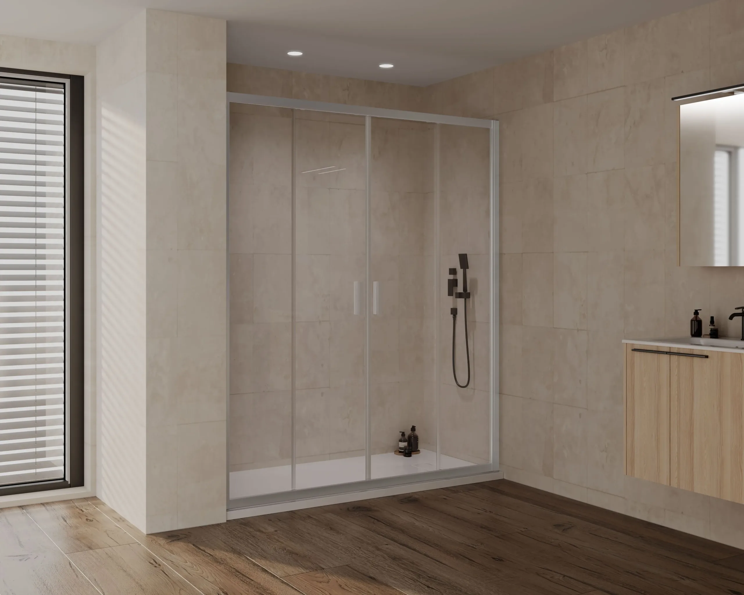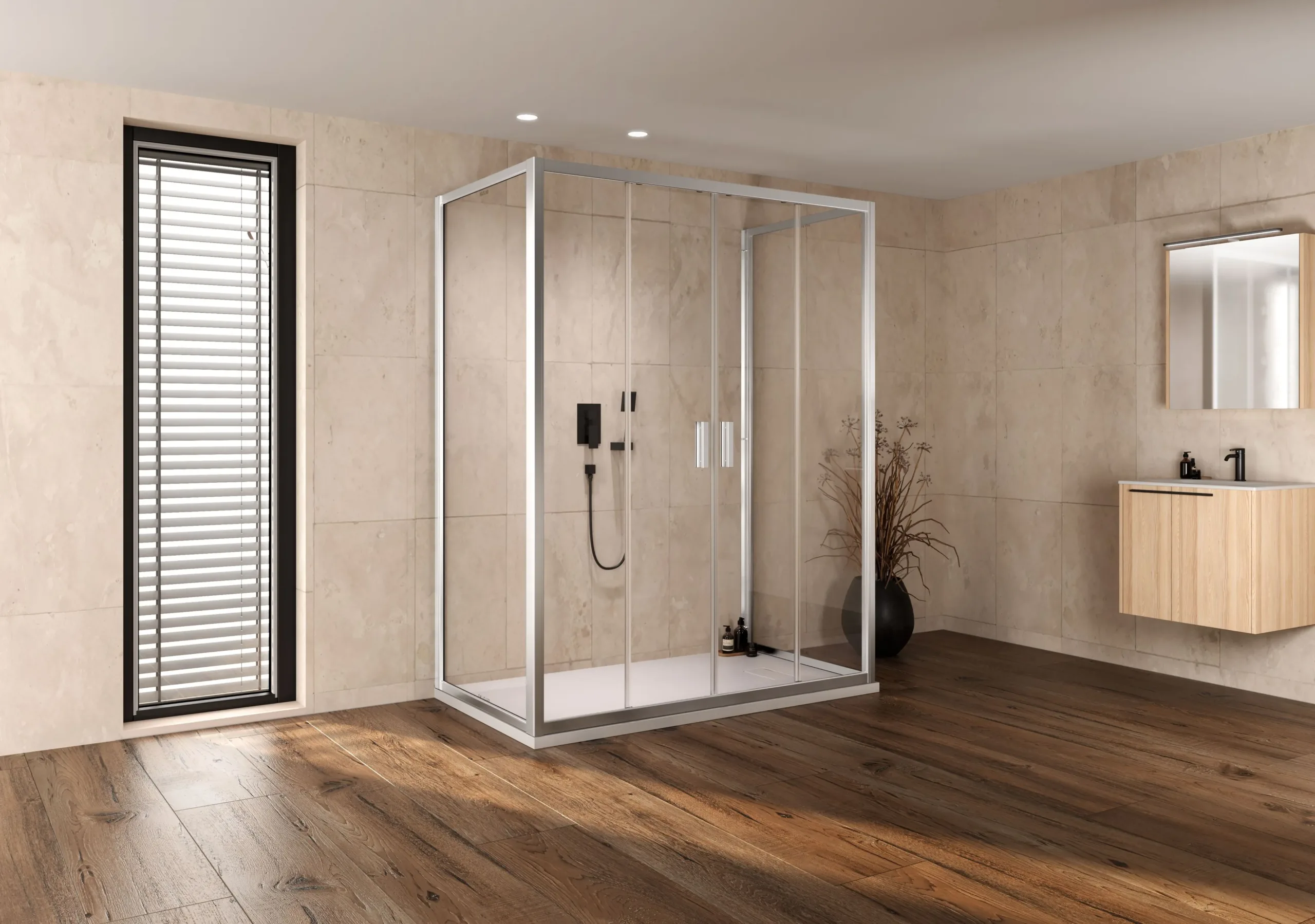 Za potrebe tuš prostora za koje trebaju jedna vrata od zida do zida, dolazi u 6 dimenzija 100, 110 i 120 su iz dva dela sa jednim vratima i fiksnim delom od 140, 160 i 170 ima 4 dela stakla sa vratima na sredini i dva fiskna dela sa strane.