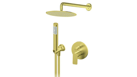 Rosan S2 Gold Uzidna baterija sa, zidnim tušem D.250mm i ručnim – Fabricka šifra: 231601G1 – S2 Gold Slavine za Tuš Kabinu kombinuju pouzdanost, precizan dizajn i vrhunsku funkcionalnost, prilagodene modernim kupatilima i kuhinjama.