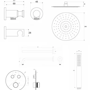 Serija uključuje slavine za kadu, tuš i ugradne instalacije, kao i kompletne tuš setove sa usponskim tuševima, kvadratnim ili okruglim maskama i dodatnim funkcionalnim rešenjima. Svi modeli opremljeni su kvalitetnim mešačima Ø35 i Neoperl perlatorima sa ograničenjem protoka za uštedu vode.