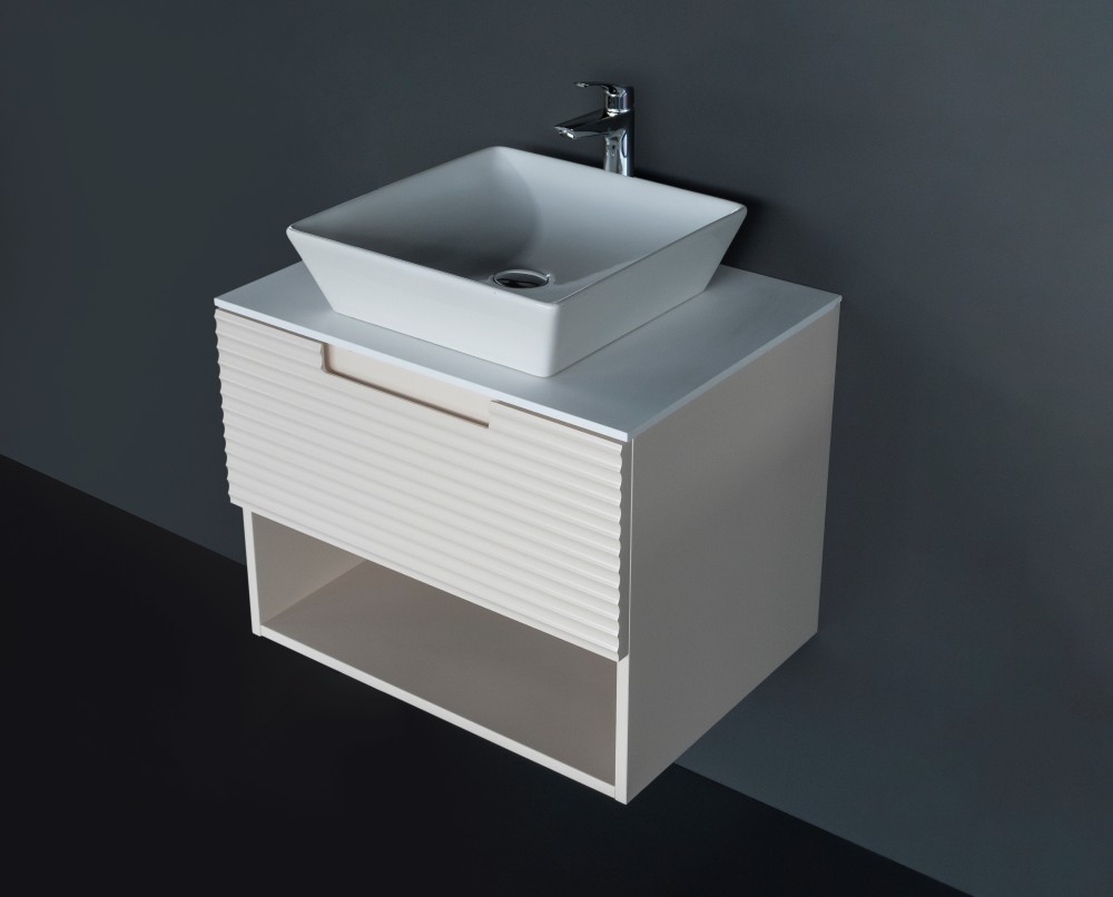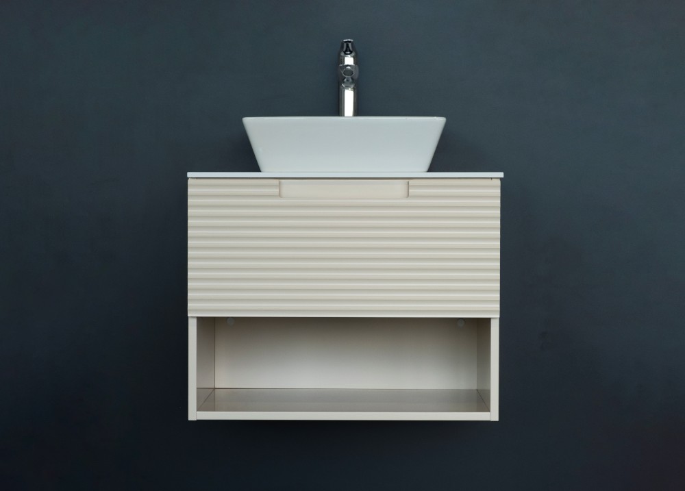 Keramički nadgradni lavabo na ploči otpornoj na vlagu i ormarić od medijapana svetlo bež boje pravouganog oštrog oblika. Minimalistički stil