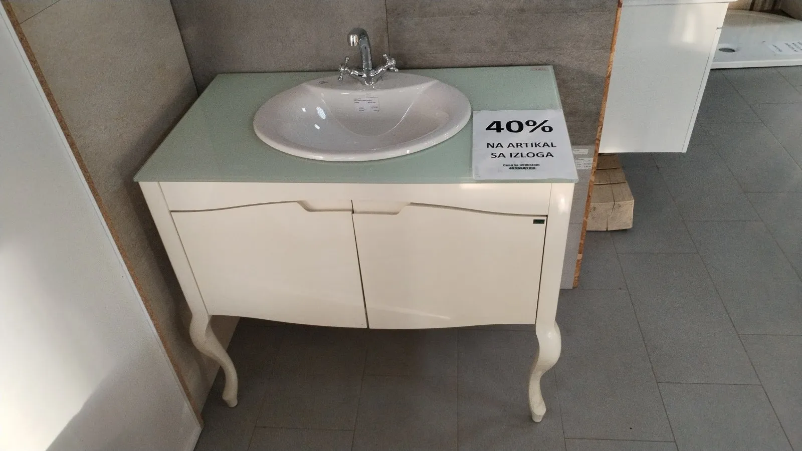 Furnirani MDF beli lakiran u visoki sjaj sa masiv nogarima i keramičkim ugradnim umivaonikom u staklenu ploču