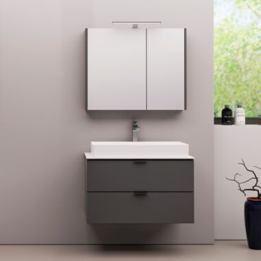Keramički nadgradni lavabo na ploči otpornoj na vlagu i ormarić od medijapana tamno sive boje pravouganog oštrog oblika. Minimalistički stil
